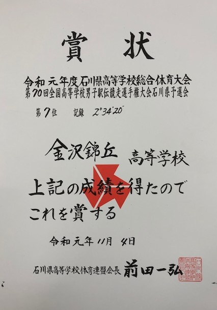 文化部の囲碁・将棋部及び書道部の2年生および陸上部の諸君が大会等で好結果を残してきてくれました。全国高文連将棋高校新人戦石川大会男子の部において21H中野快さんが第3位を、金沢地区美術展書道部門において27H岡谷葉優さんが優良賞(82出品中3位相当)を獲得しました。また、全国高等学校男子駅伝競走選手権大会石川県予選会において陸上部のチーム(17H雨池祐大さん、28H倉田久瑚さん、27H田村亮介さん、24H六角祥飛さん、17H一宮優介さん、16H横山幸一郎さん、15H岡本寛汰さん)が第7位に入賞しましたした。おめでとうございます。(よく頑張りましたね