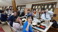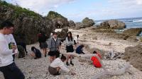 砂浜に住む生物の生態観察など。ヤドカリ探しにも必死で取り組みました。その後琉球村へ行き、昼食にタコライスセットをいただきました。