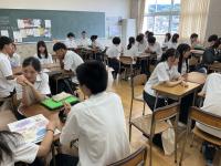 7/16(火)6限に、1年生1学期の探究プロジェクト「学部・学科研究プロジェクト」の全体交流会を実施しました。生徒達は10種類の学部・学科に分かれ、紹介ポスターを制作しました。交流会ではポスターに書いてあることに加え、これまで調査したことを丁寧に説明している様子や、聞き手が熱心に質問している姿が見られました。これらの作成したポスターは、保護者懇談会期間中5階のフロアに展示しますのでぜひご覧ください。