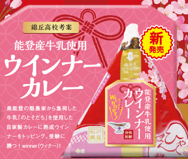 ※「winner (勝者)」と「ウインナー」、「(志望校に) 受かれ」と「カレー」をかけており、パッケージデザインがお守りになっている、大変縁起のよいおにぎりです(デザインも生徒です)。また、能登への応援の意味から能登産の牛乳を使っています。