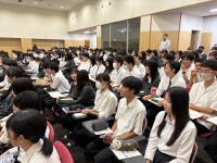 森学校長より、全体で行動する中で、自分だけが楽しいものではなく、周りのこともよく考えて行動するようにというお話がありました。中村学年主任からは、周りのことをよく考え、楽しい修学旅行にしようという旨のお話がありました。合わせて、旅行会社担当青葉さん、保健関係、生徒指導関係からそれぞれ旅行に向けてお話をしていただきました。