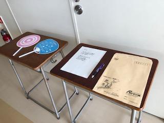 本日から、生徒たちは夏休み、学校では保護者懇談期間が始まりました。やっと梅雨も開け、夏らしい強い日差しが降り注ぎ、30度を越える気温の中、たくさんの保護者の方においでいただきました。順番を待っていただく教室前は、残念ながら冷房は効きません。窓からは熱風が・・・そんな環境を思ってか、うちわを置いてあるクラスがありました。(このクラスには椅子に座布団も敷いてありました。おもてなし、ですね。)