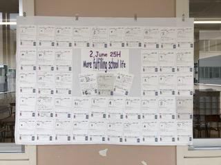 今日は試作をしました。生徒同士がお互いにアドバイスし合い、真剣にそれを聞き、実行する仲の良いあたたかいクラスだということが分かりました。みんな最高の笑顔でした。教室の黒板アートには担任の「匡史」先生が描かれています。生徒のみなさん、似ていますよね。笑