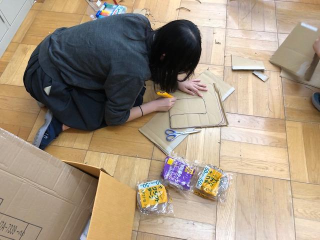 前日準備から気合十分の生徒たちはすごい勢いで教室の中に「ストーリー」を作り上げていきました。宝探しのスペースではどうやって隠す場所を増やすか工夫したり、ゲームや装飾に使うキャラクターのシルエットやイラストを切り抜いたり。