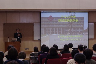はじめに、教務主任から、類型登録の説明と注意・科目選択・来年度のクラス編成・大学入試についての説明があり、つづいて1学年進路担当より生徒の学習状況などの説明がありました。