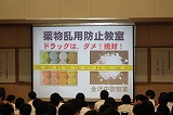 薬物には危険な特性(依存性、耐性)があること。石川県では薬物乱用での検挙数が増加傾向にあること。高校生での飲酒・喫煙から薬物乱用が始まることもあり、また身近な人物から薬物の誘いがあるかもしれない。「誘惑に負けない!!絶対に使わない!という強い意志が必要である」と強調された。