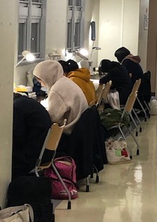 寒い日が続いていますが、3年生の中には、快適な暖かい場所を避けて、あえて寒い場所で防寒着を着ながら頑張る生徒が見られます(たまに制服だけの生徒もいてビックリしますが・・・)。寒い廊下や外のテラスで勉強している生徒たちに、「寒くないの?(場所を変えたらどうや?)」と思わず声をかけると、「寒い場所の方が集中力がとぎれないから・・」や「この場所で勉強するようになって、国語の成績が大幅に上がったんや。」などという返答が返ってきます。教員としては、「体調だけはくずしてくれるなよ。」と念じるような気持ちになるのですが、「きっといい結果につながってくれよ。」と、工夫している彼ら彼女らをますます応援してやりたい気持ちにかられるのでした。