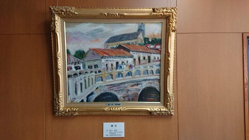 さて、今日紹介するのは、「梅花之図」と同じ昭和62年に、創立25周年(というより金沢二中90周年だったようです)を記念して、錦丘高校同窓会から寄贈された、「暮色」<162×130>。作者は洋画家の大家、村田省蔵氏です。畠山氏の30年後、昭和21年に金沢二中(現錦丘高)卒、金沢美術工芸専門学校(現金沢美大)1期生で在学中より日展入選、昭和36年に日展特選、平成10年に日展内閣総理大臣賞受賞と風景画を中心に精力的に作家活動を繰り広げられました。村田氏の油彩画は、その力強く大胆な構図とある時期を境に大きく変わった多彩な色使いが特徴です。この「暮色」は、すでに名声を得ていた重厚な色彩から、さらなる高みを求めて向かった、カラフルなメキシコでの取材旅行(昭和47年)を経て、画面が明るく一新される、そのちょうど過渡期の一作だと、堀は見ています。この絵の題材・風景はどこでしょう?夕暮れに赤く照らされた屋根、中央部に描かれた石橋の欄干にたたずむ4人の纏う服の明るい色、いかにもというメキシカンハット。同じ制作年の傑作に、石川県立美術館所蔵の「午後の町」という極めて明るい色調の絵があり、その絵に向かう一歩手前の絵ではないかと推測しています。名声を得ていても、そこにとどまるをよしとせず、なお、高みを目指して、恐れず、変える。錦魂ここにあり、の一品です。是非、近くで見てみてください。