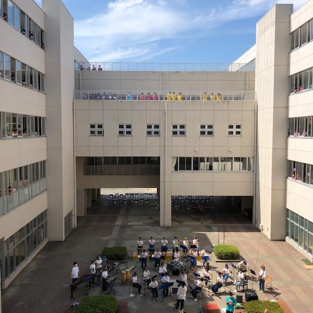 午後からNスクエアで行われた『吹奏楽ステージ』の様子です。吹奏楽部の単独演奏、野球部とのコラボ演奏、本校の先生方とのコラボ演奏と続きました。漫画”ワンピ-ス”の主題歌の曲演奏では野球部の諸君が、”パプリカ”の曲演奏では本校の先生方が曲に合わせたダンスを行いました。(踊っていた先生については、是非お帰りになったお子様に聞いてみてください。)校舎の窓やテラスにはたくさんの笑顔が見られました。