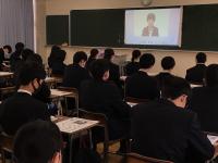放送部の司会のもと、中学校と高校の生徒会長のあいさつ、昨年の紫錦祭(文化祭)と、ブラスバンド部、応援団などの映像がそれぞれのクラスで上映されました。