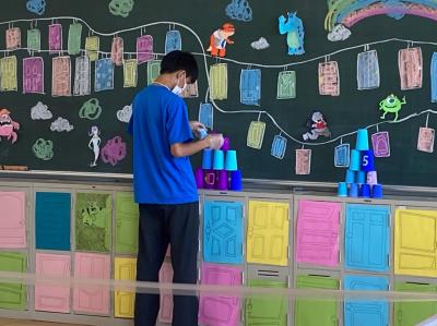 28Hの催事「BLUE MONSTERS ~ブーと一緒に冒険しよう~」では、椅子を漕ぎながら?積み上げられたカップをどれだけたくさん&早く倒せるかに挑むゲームができます。