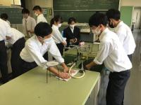 実験では、初めに水を沸騰させた中に、25%塩化鉄(Ⅲ)の水溶液を入れて、水酸化鉄(Ⅲ)のコロイド溶液を作りました。これを使って、透析やチンダル現象、塩析などコロイド溶液の性質を実験を通して学びます。目の前で起こっている現象について事前に勉強したプリントで確認するグループ、試験管の中で沈殿ができる様子をじっと観察するグループ、レーザー光線を当てたビーカーを確認するグループなど、どの生徒も真剣に取り組んでいました。最後の片付けも協力して行っています。