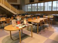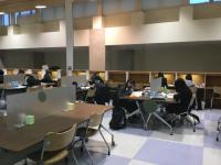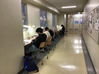 たとえば、マルチメディアセンターの5階(1番目の写真)、ここでは原則、私語ができません。みんな静かに自習しています。友だちに質問しながら勉強したい人は、4階の化学講義室(2番目の写真)に集まっています。購買前のスペースは小さな声なら相談してもよいようです。冬を迎え、購買前のスペース(3、4番目の写真)には寒さよけのカーテンが設置されています。外は雨で寒いですが、校内はみんなのエネルギーで暖められています。