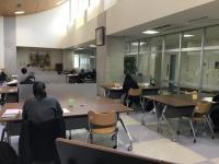 本校の自習場所のひとつ、マルチメディアセンター5階を紹介したいと思います。4万冊を超える蔵書を持つマルチメディアセンター(図書館)は4階と5階が階段でつながり、5階が自習スペースになっています。1人ずつ壁に向かって勉強できるスペースが16席、2人ずつ4人が座ることができる座席が42席、計58席あり、今日もたくさんの生徒が利用していました。この場所は天井が高く、常に暖かくて明るいことから、心地良く勉強することができます。さりげなく絵や観葉植物が飾ってある他、受験用の赤本が置いてあり、いつでも閲覧することができます。
