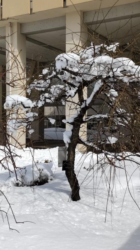 校舎前の白梅にウグイスに似た鳥がとまっていました。オナガでしょうか。どちらにしても春の鳥です。校舎の日陰にはまだ雪が残っています。雪が溶けて、春になりますように!