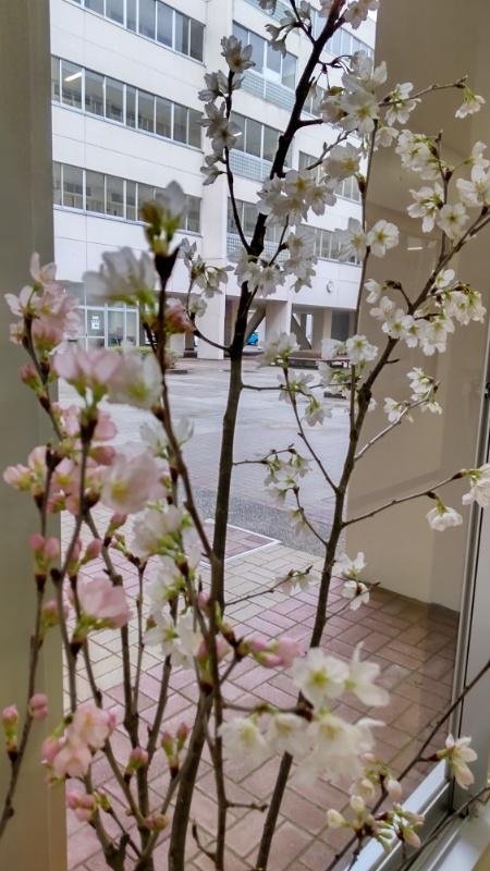 堀が先週から校長室前に持ち込んだ紅白の桜。良いタイミングで咲かせることができました!めでたし、めでたし。