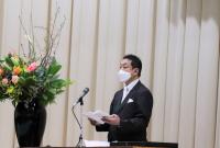 校舎正面のしだれ梅が花をほころばせ、伏見川の川辺にも春の気配が感じられる今日のよき日、同窓会長 宮川外志様、PTA会長 井波秀俊様をはじめ、ご来賓の皆様には、公私ご多忙の中、お祝いに駆けつけていただき、誠にありがとうございます。