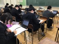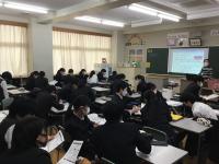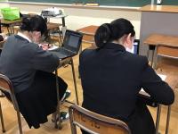 全国の学校に高速大容量の通信ネットワークを整備し、多様な子どもたちに最適化された創造性を育む教育を実現することを目的としたGIGAスクール構想のもと、今年度5月から、本校でもChromebookを活用した授業が展開されています。今までは、限られた台数を教員が運び使用していましたが、この3月、全校生徒分の台数が届いたおかげで、14日から、いつでも1人1台のChromebookを使うことができるようになりました。今日も、いくつかの授業でChromebookが活用されていました。移動させる時間がかからないため、活用頻度も上がることと思います。これから、どのような授業が展開されていくか楽しみです。