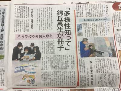 2月7日(月)の錦高日記で、みなさんにお知らせした、2年課題研究の「Orattya!」が、3月5日(土)の北國新聞の朝刊で紹介されました。2年生4人が「総合的な探究の時間」の課題研究で、普段の生活であまり接点のない人たちのことを理解することを研究テーマに設定し、本校に隣接するろう学校の生徒さんや県内外に暮らす外国人に取材しました。そして、身近でありながら、あまりよく知らなかった方々のことを冊子「Orattya!」にまとめ、校内に配布しました。この活動を通して、冊子を作成した4人は「多様性を知ってほしい。」「異なる個性の人たちが自分らしく生きるにはどうすれば良いか、考えを共有する場を持ってみたい。」と語っています。