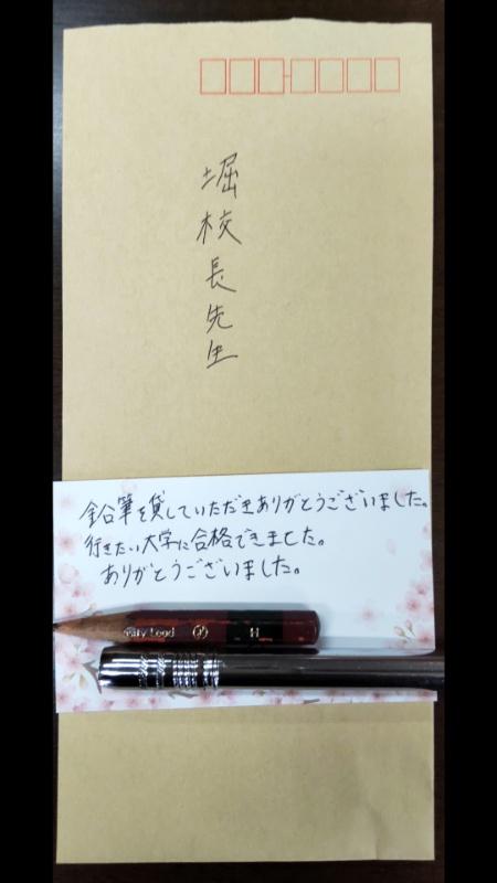 昨日、昨年度の卒業生が事務室にこれを預けていった、との連絡あり。堀が錦丘中の卒業式に参列していた時間帯だったため、会えず・・・ザンネン!封筒を開けてみて・・・ビックリ!堀が18才の頃、大学受験に備え、実際に共に戦った「戦友」「トモダチ」であるエンピツを、昨年度も今年度同様、「お守り代わりに諸君の筆箱に忍ばせて連れて行ってもいいよ~。」と、35H前に置いておいたのです。「受験が終わったら、返してね。」と事前に伝えてあったのですが、昨年度末になっても、数本(人?)と(エンピツ)補助器が未返却のまま・・・ま、いっか。だれか記念にでも持って行っているんなら・・・と思ってました。戻っては来ない、と思ってました。ところが・・・きのう・・・とつとつとしたコトバですが、「感謝」の気持ちがよく伝わってきました。こちらこそ、ありがとう!頼ってくれて。少しでも力になれたのなら、こんなうれしいことはありません!!!「忘れた頃に・・・」教員をやっててヨカッタ!と思える瞬間のひとつです。1年間の浪人生活が実りましたね!おめでとう!!この場を借りて~~~祝!合格!!!