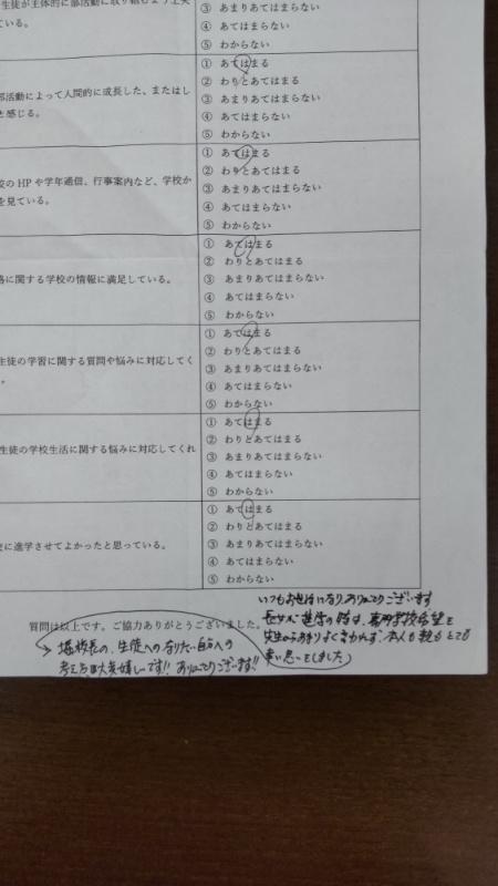 今、少しづつですが、校長室内を「次の主」のために、整理整頓し始めています。机の中から、「学校評価に関する保護者アンケートのお願い」の回答用紙が出てきました。グーグルフォームではなく、直接、紙媒体で提出いただいた回答の1枚です。欄外に記入されていたコメントが、堀の心に刺さり、この1枚だけ、集計後に担当者からもらって取っておいたもの。こんな風なコトバをいただけただけで、「よしっ!やっぱ、まちごーとらん!」って、自信が湧いてくるのです。たとえ、たった1枚でも・・・お書きいただいた保護者の方、ありがとうございました。心折れずに、ここまでやってこれました。感謝いたします。生徒および保護者の方々には、もう、以前のような思いはさせてはいけない、と思います。願っています。「錦」の先生方、あとは頼んだよ。