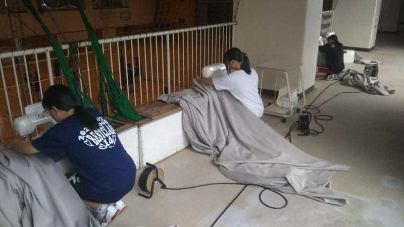 8月18日の午後、男子バレーボール部マネージャー、男子バスケットボール部マネージャーに手伝ってもらい、破れがひどかった、第1フロアランニングコースのカーテンを補修しました。お手伝いしてくれたマネージャーの皆さん、本当にありがとうございました。