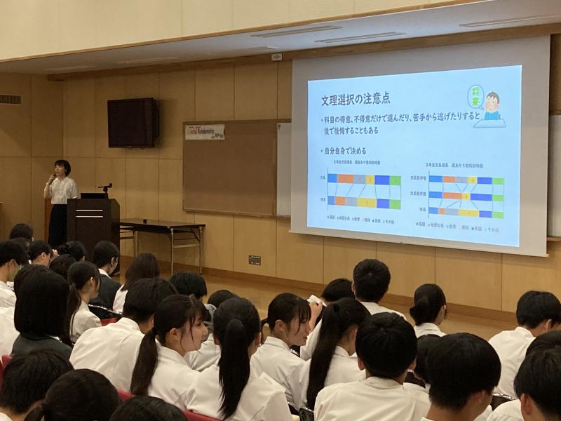1年生を対象に「類型登録説明会」を実施しました。「2年生になってから文系・理系のどちらに進むか、また、選択科目を何にするか」は、人生に影響する重大な選択です。夏休み中に大学のオープンキャンパスに参加したり家族で話し合ったりしてよく考え、最終的には「自分自身の意思で」決定することが大切です。