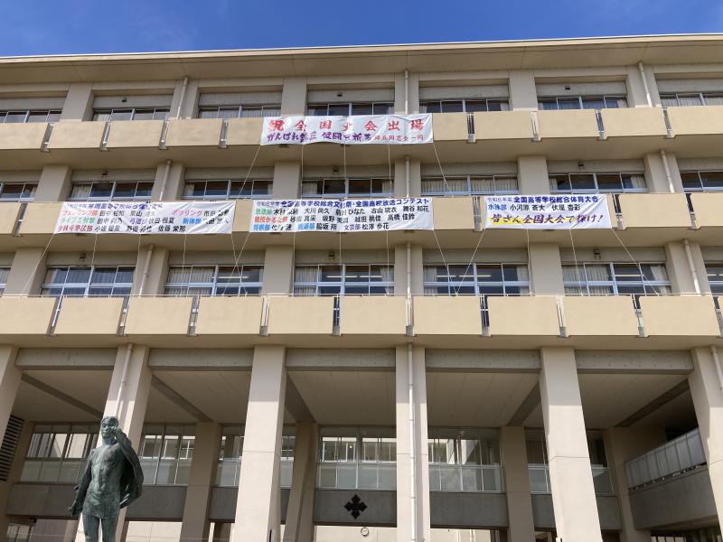 全国高校総体・高校総文・全国高校放送コンテストに出場する選手を激励するため、同窓会のご協力により横断幕が設置されました。同窓会の皆様、ありがとうございました。