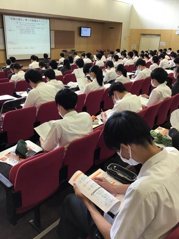 定期試験直後の時間でしたが、3年生は共通テストに関する資料を見ながら、熱心に話を聞いていました。今年は、コロナウイルスの影響により、準備や心構えも変わるのではないかというお話を聞いて、受験本番が着々と近づいてきていると感じた人も多かったのではないでしょうか。