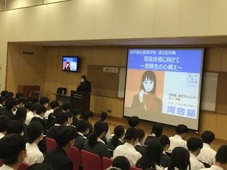 大学進学を目指す生徒は、河合塾より井上将岐氏をお招きして受験生としての心構えについて講演していただきました。基礎力を大切にすること、最後まであきらめないこと、そのためには模試を上手に活用することが重要だと教えていただきました。また、学校の先生を大いに利用し、全員で戦う大切さも教えていただきました。