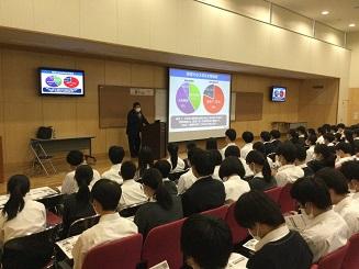 生徒は、実際に看護師として勤務されている方が、どうしてなろうと思ったのか、どうやってなったのか、なってみてどうなのかという、なる前・なるとき・なった後の三つの視点からお話を伺ったことで、看護師という仕事がどのようなものであるか明確になり、より自らの進路を具体的に考えるよい機会となりました。