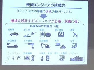 金沢大学機械工学類の木綿隆弘教授と若子倫菜准教授に来校いただき、入試制度の概要や機械工学類での学びの内容、さらに、機械工学類を卒業した後の就職状況についても説明していただきました。