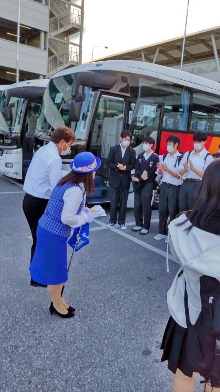 沖縄のバスガイドさんとドライバーさんに金沢土産贈呈。「4日間よろしくお願いしまーす!」