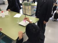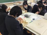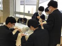 1年生は家庭科の授業で、エコバッグを製作しています。ミシンを使って内袋を作ったり、スナップボタンを縫い付けたりすることを通して、手縫いやミシンの技術の向上を図ります。また、全員同じ無地のエコバッグのため、他の人と区別できるようにワンポイントの刺繍を入れることも課題の1つです。黙々と刺繍したり、友だち同士でミシンを教えあったり、どの人も意欲的に作業をしていました。普段の生活の中で針や糸を使うことがない人が多く、家庭科の授業は貴重な機会となっています。自分のできることを1つでも増やして、これからの生活を豊かにしてほしいです。