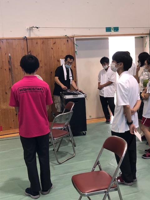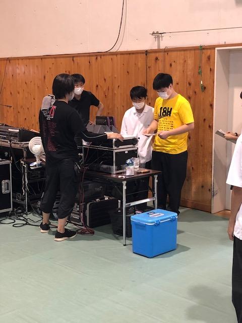 また、ステージ発表を裏方として支える音響係や照明係を担う生徒たちも、真剣に業者の方から機器の使用方法を学んでおり、準備を進めています。(頼むよ!!)