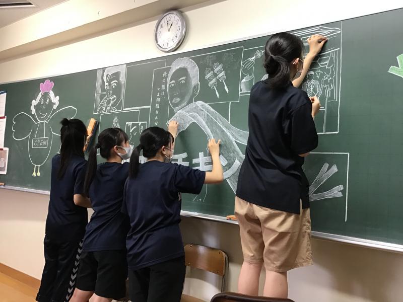 今日は試作をしました。生徒同士がお互いにアドバイスし合い、真剣にそれを聞き、実行する仲の良いあたたかいクラスだということが分かりました。みんな最高の笑顔でした。教室の黒板アートには担任の「匡史」先生が描かれています。生徒のみなさん、似ていますよね。笑