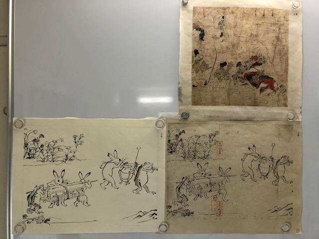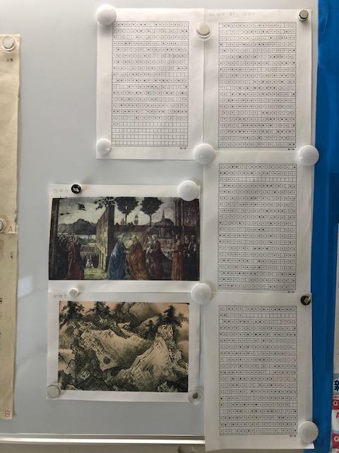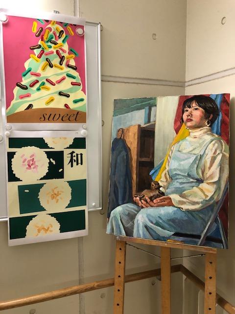 現在その場所には、美術系大学へ進学した卒業生もしくは在学生たちの作品が展示されています。中には美術作品に対する論文も掲示されており、一口に美術といっても色々な分野や側面があることが分かります。