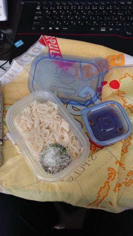 し、白い!限りなく白いお弁当。As white as snow・・・薬味のわずかな緑がアクセント。ここにつゆをぶっかけて・・・めんが小さな一口状にくるくる幾層も丸めて重ねてあって・・・大きめの保冷剤で挟んで持参すれば、お昼頃までは十分冷たくて大丈V(古っ)!つゆをぶっかけたら、カンタンにめんはほぐれます。めん1束分でも、十分おなかいっぱい。蒸し暑く、食欲減退のお昼ごはんには意外とイケます。つゆにもちょっち(具志堅風に)一工夫。ラー油をお好みの分量、たらし込んでみて!ゴマの風味と辛みの刺激で食欲マシマシ。そうめんにラー油、合うんです!しかも、食事時間超短縮可能。本日の堀の完食までの時間、1分25秒!あっちゅうま!食後しばらくすると、ずうんとおなかに来ます。胃袋でつゆ吸って、めん膨張。おなか、ぱんぱん。お弁当作成者に負担かからず(そうめん1束ゆでて、水にさらして、水きって。ジップロック容器に一口サイズに丸めて入れていくだけ。薬味はお好みのものをラップするのみ。つゆもお好みのものを小さめのジップロック容器<パチンと閉まる容器。こぼれないように。>に注ぐだけ。ラー油もお好みでたらし込み。)、弁当箱洗いもラクラク。1度お試しあれ~。自分でも作れるよ。栄養バランスについては、その日の朝食や晩ご飯で調整してね。こればっかりはNG!ではでは。今日はこの辺で。CU ASAP!