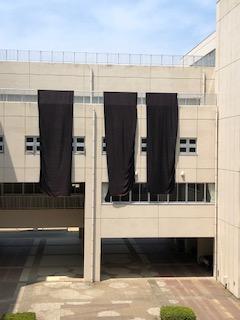 本日も暑い日でした。そんな太陽の日差しを吸収するかのように、黒い、大きな、布製の物体が、4階渡り廊下に3枚掛けられました。皆さん、これ、何だかわかりますか?