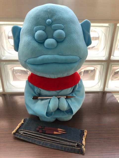 さて、3年生の教室前の廊下を歩いていくと、今年も本校の守護神のお地蔵様が鎮座しています。ふっと見ると、鉛筆を持っていました。それに、前にはジーンズ地の筆入れが・・・はは~ん、これが校長先生が「ほりほりの部屋」で書いていた鉛筆なんだ、と気付きました。この鉛筆を使えばハイスコアが望めるのかな~、特に英語はいけるんじゃないか、などなど思いました。