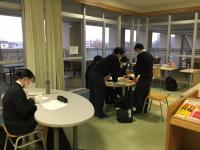 たとえば、マルチメディアセンターの5階(1番目の写真)、ここでは原則、私語ができません。みんな静かに自習しています。友だちに質問しながら勉強したい人は、4階の化学講義室(2番目の写真)に集まっています。購買前のスペースは小さな声なら相談してもよいようです。冬を迎え、購買前のスペース(3、4番目の写真)には寒さよけのカーテンが設置されています。外は雨で寒いですが、校内はみんなのエネルギーで暖められています。