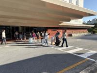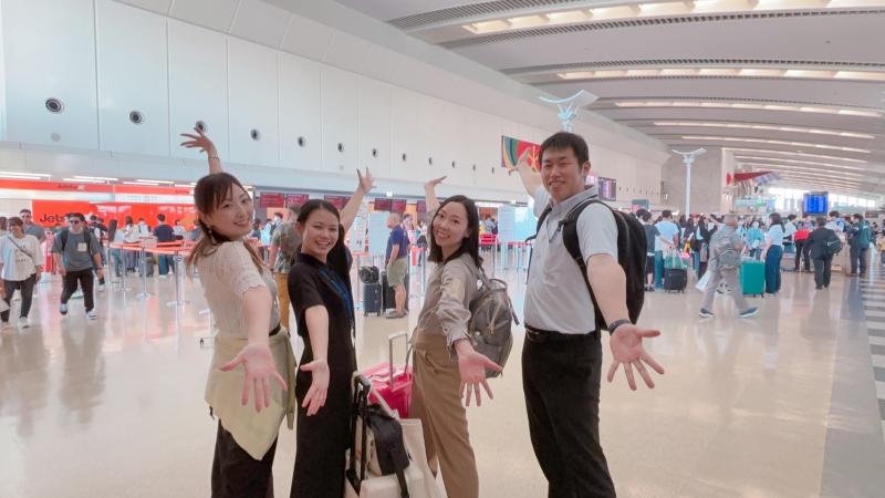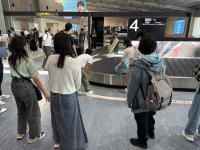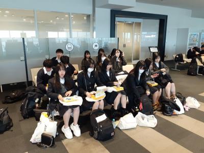 空港に到着しました。疲れの様子も見られますが、最後までよく頑張っています。これから伊丹行きの便に搭乗します。