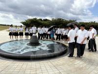 午前はひめゆりの塔・ひめゆり平和祈念資料館を訪問しました。館内では、当時の女子学生たちの証言や資料を通じ、戦争の悲惨さと向き合う時間となりました。1日目の平和講話と関連する資料が沢山あり、生徒たちは真剣な表情で展示に目を向けていました。慰霊碑の前では手を合わせ、それぞれが静かに平和への思いを心に刻みました。
