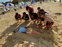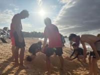 砂浜に住む生物の生態観察など。ヤドカリ探しにも必死で取り組みました。その後琉球村へ行き、昼食にタコライスセットをいただきました。