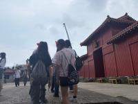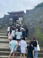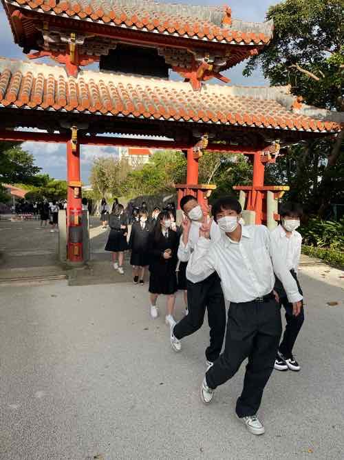 首里城は那覇の高台にあり、公園内もやや急な傾斜が首里城まで続いていました。階段も傾斜があり、生徒も登るのが大変そうでした。