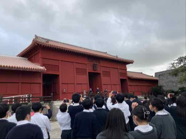 首里城への最後の門、奉神門で開門の儀を見ることができました。本校だけでなく、たくさんの生徒が儀式の様子をカメラに収めていました。