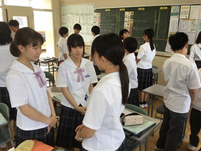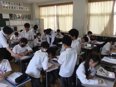 2年生社会の授業では、生徒たちが「東京は〇〇の中心」というテーマでカードを作成し、友人同士で交換しながら交流を深めました。