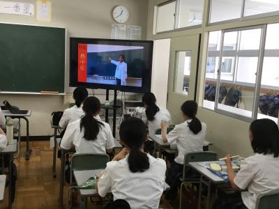 3年生は、視聴覚室で合同国語を行いました。今回は特別に、錦丘高校の内進生の担任でもあり、国語科を担当している岡本先生の講義を聞きました。