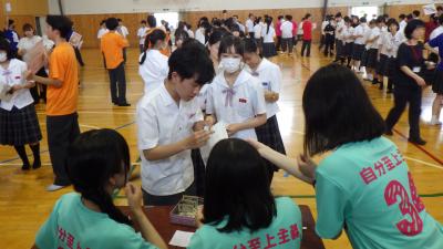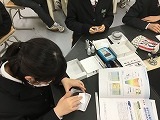 今日はまず、生産(ものづくり)の視点で、実際に紙コップをつくりました。生徒達は、グループ内で、社長、設計担当、組立担当、会計担当と役割分担し、限られた材料と設備で、どうやったら利益がでるか、いかにコストダウンをするかという視点で、試行錯誤していました。
