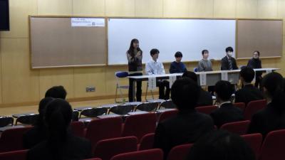 また、すでに、東北大学や早稲田大学等の難関大学に自己推薦制度で合格した先輩達にもきていただき、生の声をきくこともできました。錦中生の強み(全教科の表現力、英語のリスニング力、協働的に学べる力等)を活かし、自分のキャリアを真剣に考える貴重な機会となりました。